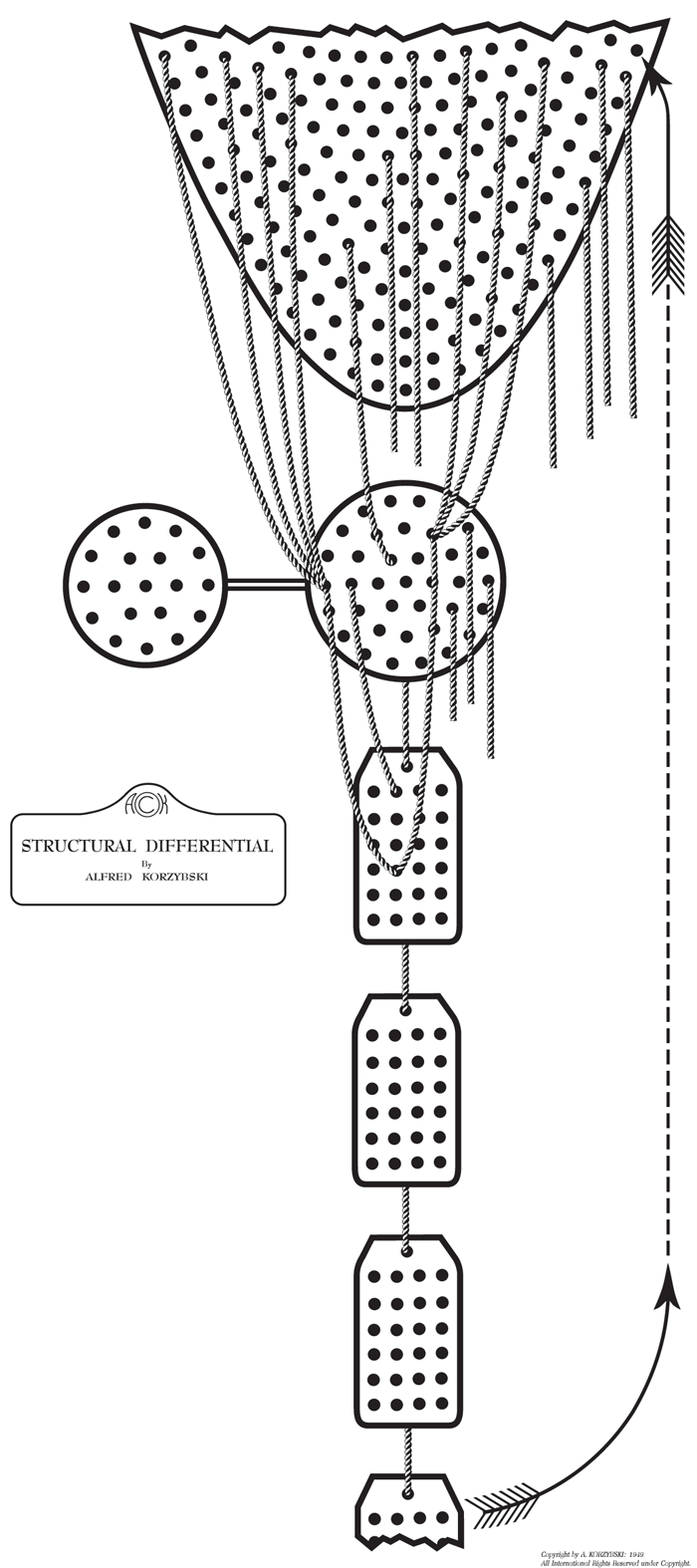 In the meantime, as that group in the New School was so important and so intelligent, I was very eager to make good to that particular class in spite of Dewey and Watson, and I was eager to convey the difference between the reaction of humans and dogs, cats, and so on, what are usually called ‘animals’. I was struggling with myself how to convey that fundamental difference, and somehow under that stress, pressure, of necessity — I would even use the word ‘emotional stress’ — of conveying what I wanted to convey, as a flash, a diagram occurred to me, the diagram which today is known as and called the ‘Structural Differential’. Originally I called it the ‘Anthropometer’, which I later changed to ‘Structural Differential’ because ‘Anthropometer’ had implications as a measurer, eventually, of humanity, and there was nothing ‘measuring’ there in the actual physical sense, except perhaps in the sense that it was a standard of evaluation [for determining the] difference between humans and animals. So I changed the name from ‘Anthropometer’ to ‘Structural Differential’.